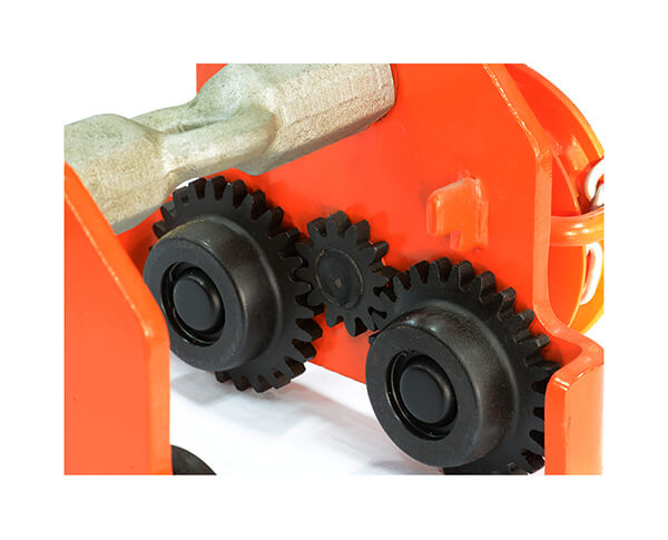 It is driven by pulling the hand chain and travels along the lower edge of I-beam.