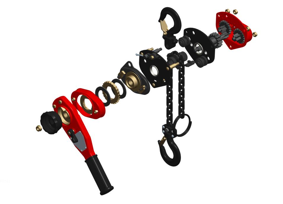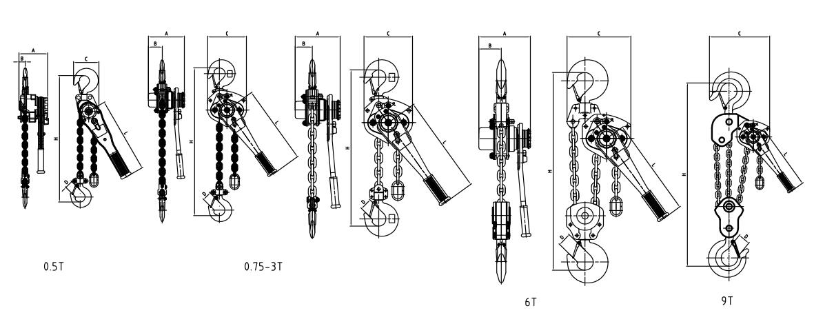 | Model | W.L.L(t) | LIFT(m) | Proof Load(KN) | Lever Force kg(n)(ibs) | Load Chain | Dimensions(mm) | N.W.(kg) | ||||||