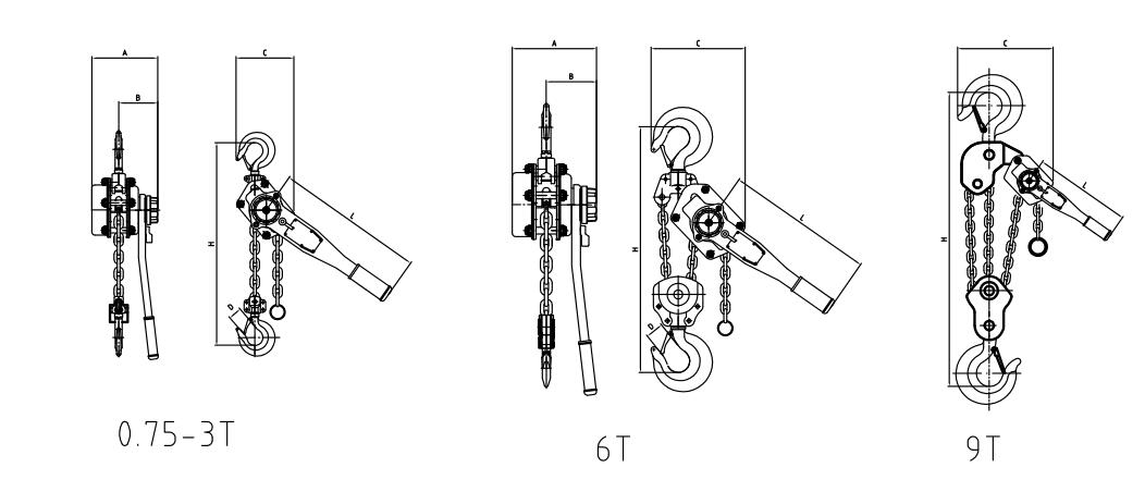 型號 額定載荷(t) 起升高度(m) 試驗載荷(t) 手板力 kg(n)(ibs) 起重鏈條 尺寸規格(mm) 重量